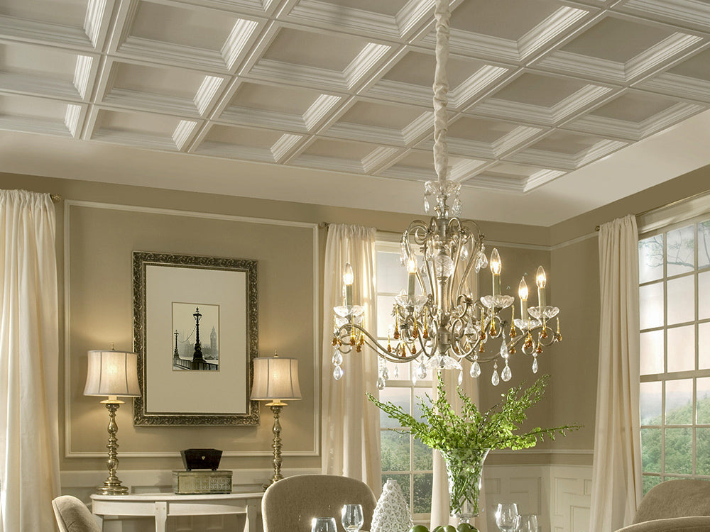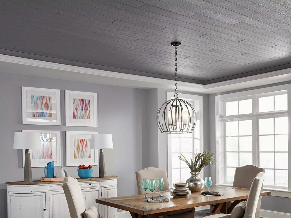 No matter what size dining room you have, you can easily enhance your space design with a decorative ceiling. Choose from a range of different looks: wood-look ceiling planks, tin-look mineral fiber tiles, coffered ceiling panels, or decorative mineral fiber tiles for dining room decorating ideas that match your taste.