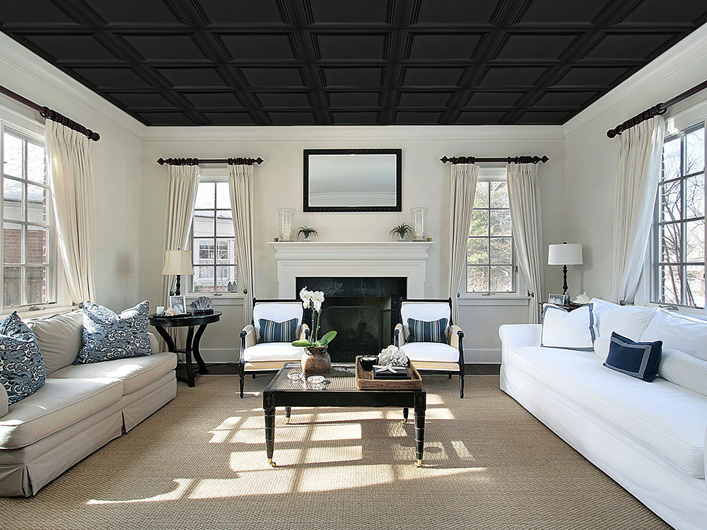 High ceilings call for more elaborate details/decoration to fill up space. When a ceiling is too simple for its height, the room can appear somewhat empty. Feel free to try your boldest selections here, like a deep or shallow coffer. Remember, too, that the right texture or pattern can transform your living room ceiling without feeling too drastic.